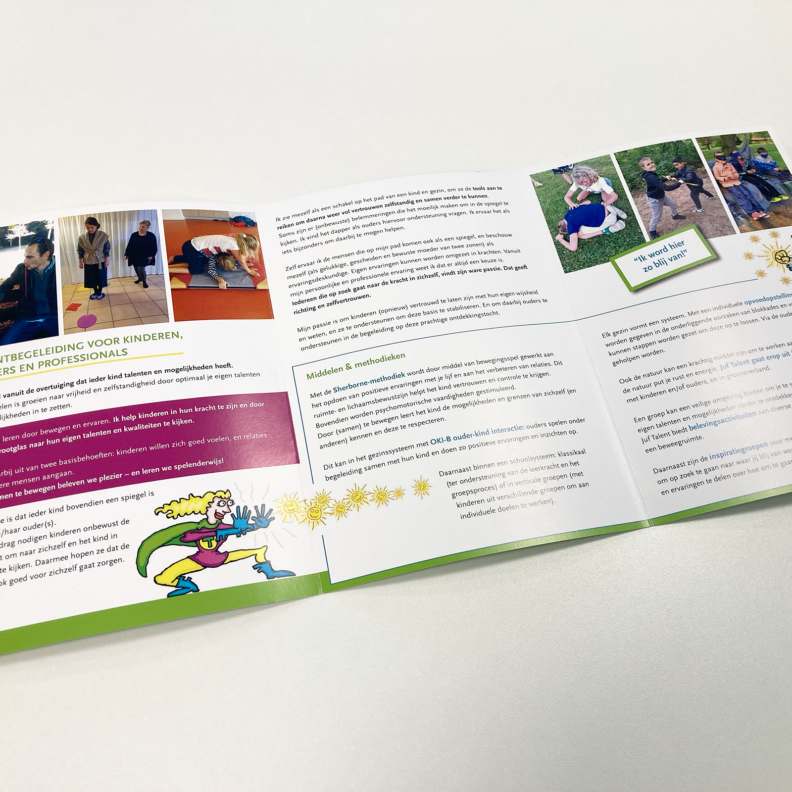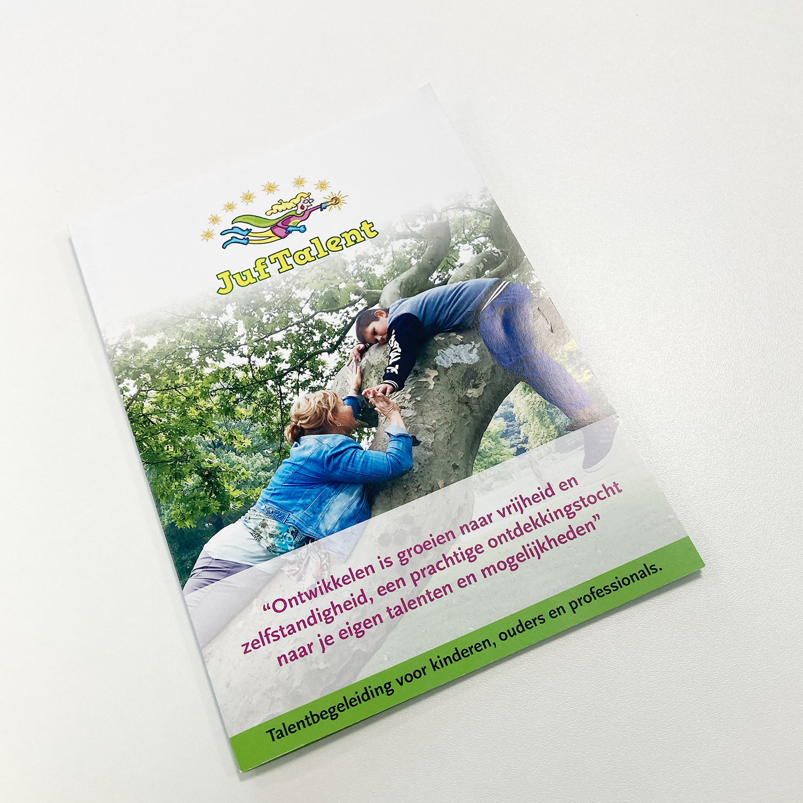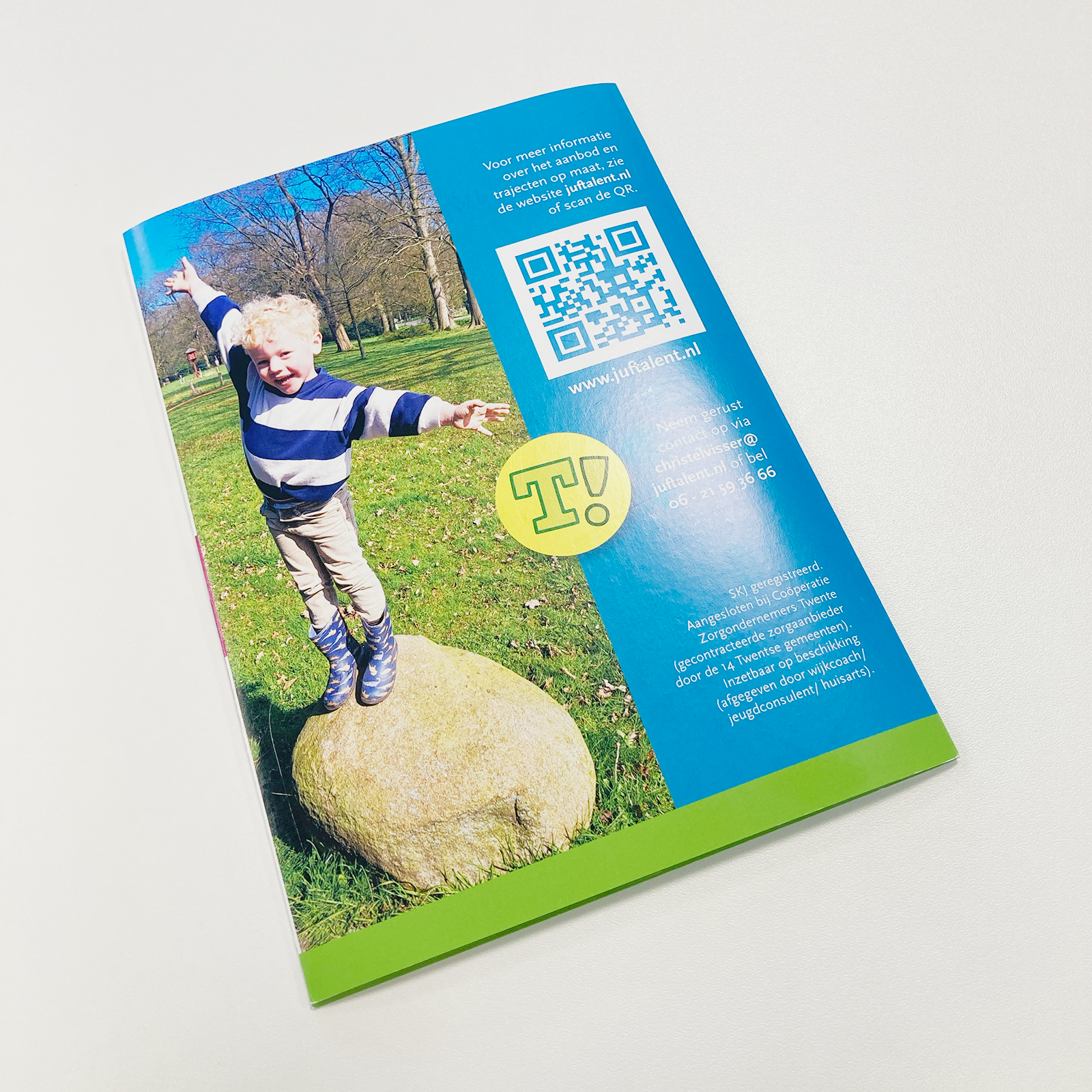 Dat Dus verzorgt de vormgeving van folders en flyers die Juf Talent inzet om haar trajecten onder de aandacht te brengen bij scholen, ouders en andere betrokkenen. We werken daarbij binnen haar bestaande huisstijl – zoals Christel al jaren herkenbaar is in haar communicatie. De middelen sluiten visueel én inhoudelijk aan bij haar werkwijze: warm, helder en dichtbij het kind.